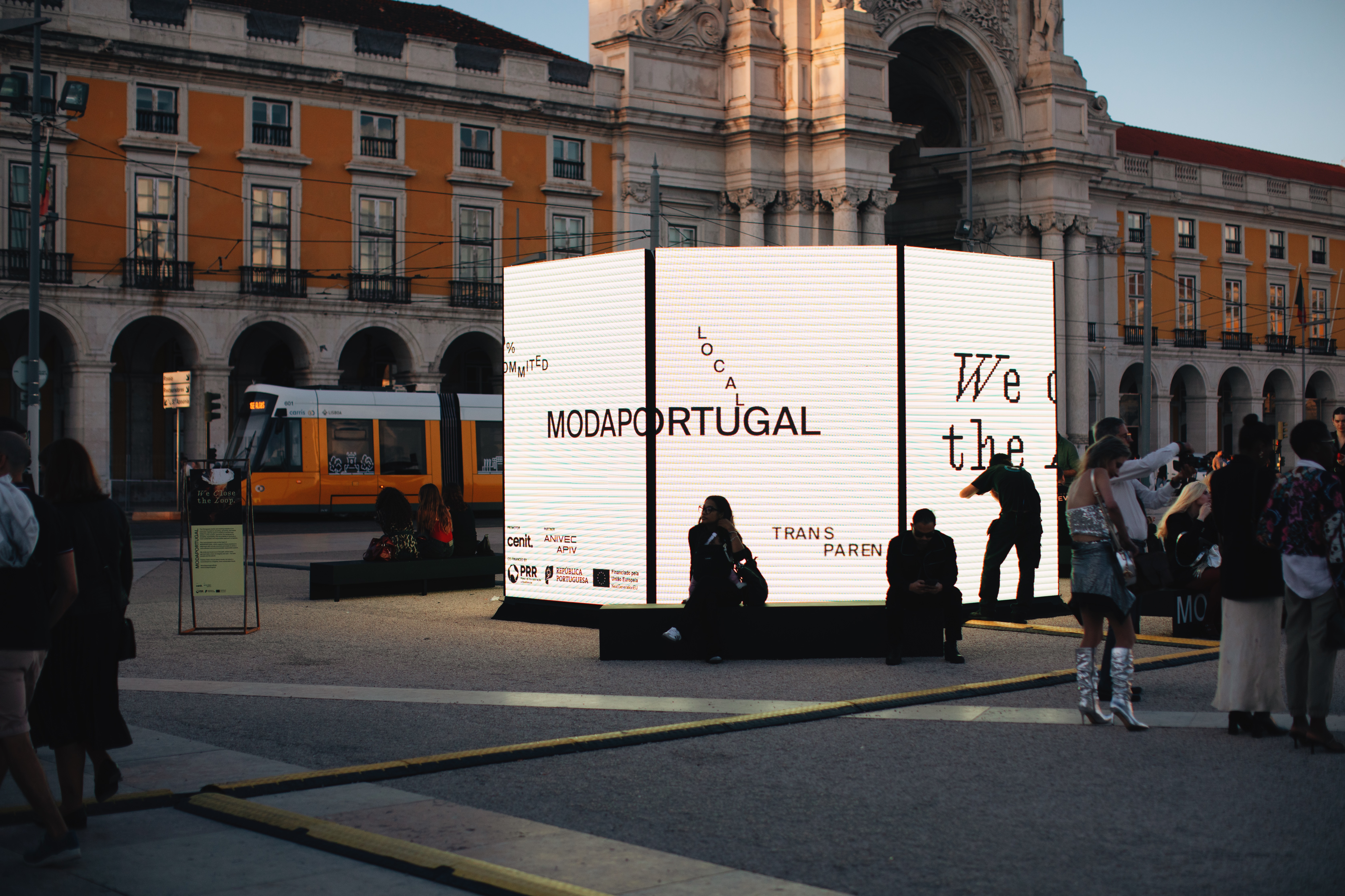 The piece showcases multimedia content from MODAPORTUGAL's archives, featuring textile and artistic fashion productions with different layers of information, such as the manifest words or motto.